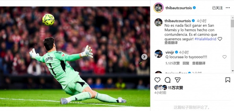 体育吧12月4日讯 西甲第19轮比赛,皇马客场3-0击败毕尔巴鄂竞技。 库尔图瓦社媒晒出扑救照片,配文:“在圣马梅斯取胜绝非易事,而我们今天赢得干脆利落。这正是我们想要继续前进的道路!”