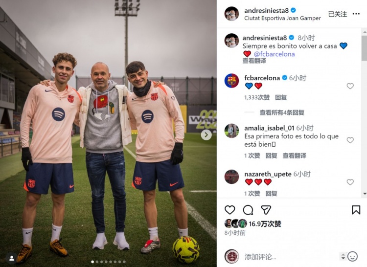体育吧12月6日讯 伊涅斯塔更新社媒动态,晒出造访巴萨训练基地的照片。 伊涅斯塔重返巴萨训练基地,与佩德里、费尔明、亚马尔、巴尔德、特狮等球员合影,他在社交媒体上晒出照片,配文:“回家的感觉总是很美好。”